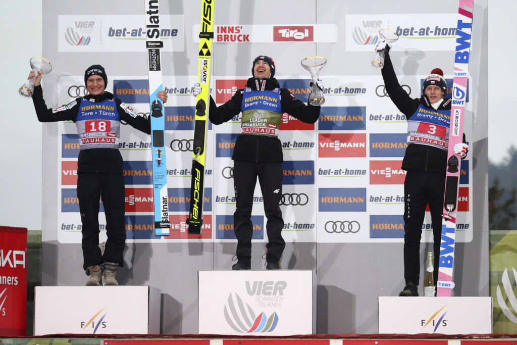 Einfach nicht zu schlagen am heutigen Tourneetag auf der kniffeligen Schanze in Innsbruck waren die polnischen Springer. Allen Voran der Routinier Kamil Stoch, der schon einmal, wie Sven Hannawald, die Vierschanzentournee 2002 mit allen Vier Siegen gewinnen konnte. Nun kam er zurück, mit beständiger Leistung, Mut und tollen Sprüngen. Mit 131,7 Punkten im ersten und 129,9 Punkten im zweiten Durchgang sicherte er sich mit einem Vorsprung von über 10 Punkten den Sieg der Innsbruck Etappe und schuf damit die perfekte Ausgangsposition für das Finale am Mittwoch in Bischofshofen. Aber auch Titelverteidiger Dawid Kubacki möchte um den Tourneesieg noch ein Wörtchen mit sprechen. Mit zwei starken Durchgängen, trotz schwieriger Bedingungen und mit reichlich Sicherheit durch seinen Sieg in Garmisch im Gepäck, landete er auf Rang Drei. Die ausgezeichnete Leistung des polnischen Teams rundete Piotre Zyla auf Rang Vier ab. Ryoyu Kobayashi landete auf Rang Sieben, Stefan Kraft as bester Österreicher auf Rang Neun.