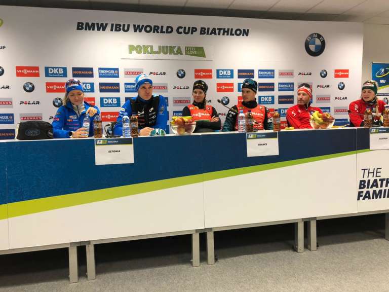 Anais Bescond und Emilien Jacquelin gewinnen für Frankreich die Single Mixed Relay auf der Pokljuka vor dem überraschenden Zweiten aus Estonia für die Regina Oja