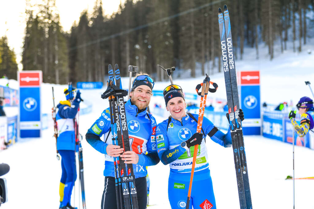 Before the race of the Single-Mixed Relay many coaches as well as experts had difficulties to predict the outcome of the competition, because there were too many strong nations, which would have been in the running for the victory and the medal places. But in the end, the three favorites from France, Norway and Sweden successfully prevailed. Julia Simon clenches her fist as she crosses the finish line as the winner and embraces her team mate Antonin Guigonnat – both can now celebrate the joint gold medal and the World Championship title in the single mixed relay. For a long time the Italian team was on course for gold, but in the end Dorothea Wierer showed some nerves and gave up the medal at the last shooting. The Norwegian duo of Johannes Thingnes Boe and Tiril Eckhoff fought for the gold medal until the end, but it was not enough to successfully defend the title. In the final meters of the race Julia Simon gave her all and managed to push Tiril Eckhoff to the silver place. The podium was completed by Team Sweden with Sebastian Samuelsson and Hanna Oeberg on bronze place. The German relay team with Erik Lesser, who had to do one penalty loop, and Franziska Preuss did not finish higher than seventh.