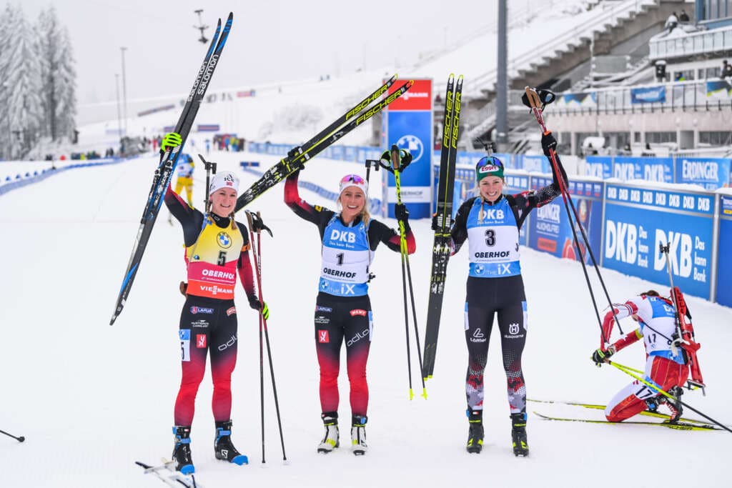 Justine Braisaz mit einem Rückstand von 1.58,0 Minuten und Julia Simon mit 2.21,8 Minuten Rückstand auf die Siegerin belegten die Plätze 11 und 16. Beste Deutsche wurde Franziska Preuss auf Platz 18
